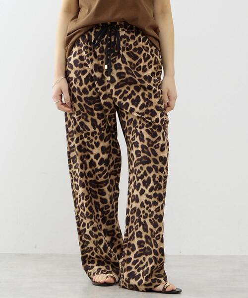 A_(A0561FB253)と同素材を使用した、オールゴム仕様のリラックスパンツ。 大人のスタイリングに取り入れやすい、オリジナルのレオパード柄プリントがコーディネートの主役になります。 ウエストは総ゴムで快適な穿き心地。 ブラックのウエストコードとゴールドのコードエンドがアクセントとなり、 ラフになりすぎず、さりげなく細見えを叶えます。 さらっとした肌触りで、暑い季節も涼しく快適。 シンプルなトップスを合わせるだけで着映えし、 1枚でスタイルが完成する存在感のあるパンツです。