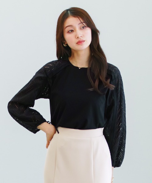 【 異素材MIX 】ドロスト付・刺繡レース切替プルオーバー「 甘さを抑えた レース袖プルオーバー 」身頃には肌触りの良い生地を使用し、デイリーにも取り入れやすいリラクシーな着心地のプルオーバー。袖はラグラン切替に刺繍レースをあしらい、異素材のコントラストがシンプルな中にさりげない華やぎを添えます。袖サイドに施したドローストリングは、絞り具合によってシルエットを調整でき、ふんわり感やニュアンスの変化を楽しめるデザイン。袖口はゴム仕様で腕まくりもしやすく、程よい抜け感をプラスします。後ろがやや長めの前後差シルエットで、アウトで着てもバランス良く、ヒップラインを自然にカバー。甘くなりすぎず、きれいめパンツからデニム、スカートまで幅広いスタイリングにマッチする一枚です。【 color 】●ホワイト●ブラック===================厚さ:★☆☆☆☆ 透け感:レース部分はあり裏地:なし伸縮性:身頃のみありケア:手洗い可シーズン:春・秋===================【 fabric 】ポリエステル94% ポリウレタン6%【 model 】SAKURA 169cm S着用MADE IN CHINA(企画・検品は日本)プルオーバー レース袖 刺繍レース ドロスト袖 異素材切替 きれいめカジュアル オフィスカジュアル 後ろ長め トップス レディース 刺繍レース