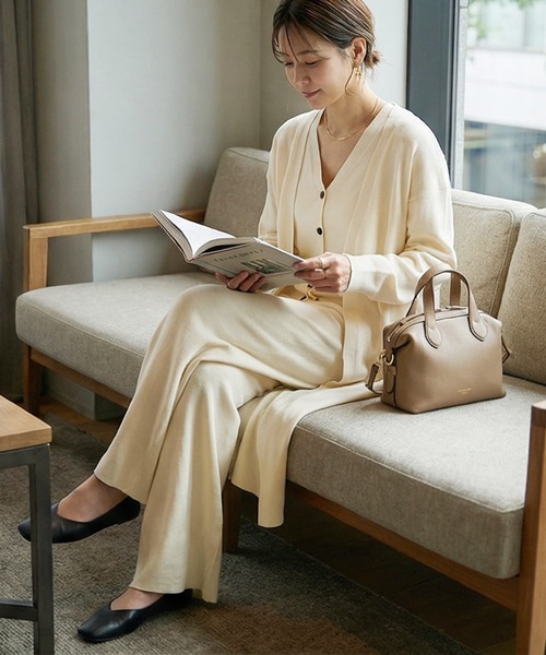 春をメインにロングシーズン活躍する、ニット素材のカーディガン・ベスト・ワイドパンツの3ピースセット。セットで着れば統一感のある洗練された印象に、それぞれ単品でも着回しやすいシンプルなデザインです。薄すぎず厚すぎないハイゲージ編みで、伸縮性があり軽やかな着心地。手洗い可能なのも嬉しいポイントです。 カーディガンは留め具のないトッパー型で、ふくらはぎにかかるロング丈。ドロップショルダーの程よくゆとりあるシルエットで、すっきりと着られます。ベストは自然なフィット感と程よい開きのVネックデザインで、一枚でもレイヤードでも着用可能。パンツは総ゴム仕様のフルレングスで、締め付け感の少ない快適な穿き心地です。 きれいめな靴で大人っぽく、スニーカーやスポーツサンダルでカジュアルにも対応。春秋はブーツ合わせもおすすめです。夏はカーディガンを軽い羽織りに替えれば長い期間着用可能。ロング丈アウターとも好相性で、幅広いスタイリングが楽しめます。 【お色について】 ・ブラック:定番的な通常のブラックです。 ・エクリュ:僅かにクリーム色素を帯びた、優しい印象のホワイト系カラーです。 【生地について】 ・シワ:できにくい方です。 ・洗い上りジワ:お手入れ方法や干し方によってはできますが、基本的にはアイロンは不要です。