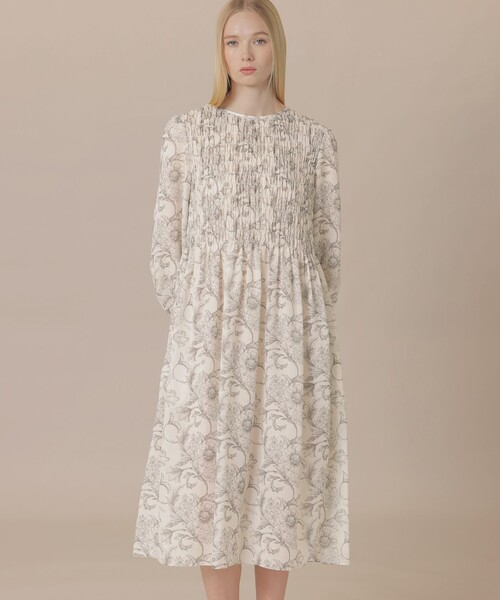 【接触冷感】【ウォッシャブル】【着用推奨シーズン:春・夏】 <BIBURY FLOWER/バイブリーフラワー> イギリス、バイブリー村の花々が咲き誇る美しいイングリッシュガーデンをイメージし、規則性のあるシンメトリックで大胆な柄を緻密に描写したブランドオリジナルのフラワープリントです。MACKINTOSH LONDONでは上品で大人のやさしいモチーフを「BIBURY FLOWER/バイブリーフラワー」と称しシーズンに合わせたモダンなアレンジで大切に使用しています。 <素材説明> 上品で洗練された繊細さとエアリー感のある素材に、新鮮なエッチングタッチのBIBURY FLOWER柄をプリントした素材です。 <機能性> 接触冷感(冷感は持続するものではありませんので予めご了承ください。) <デザインポイント> ふんだんにシャーリングを施したワンピースです。高めのウエスト位置で切り替え、スタイルアップ効果も期待できます。ほど良いきちんと感でお食事会などのシーンにも活躍するアイテムです。同素材のブラウス(品番:G5M09737)もご用意しております。