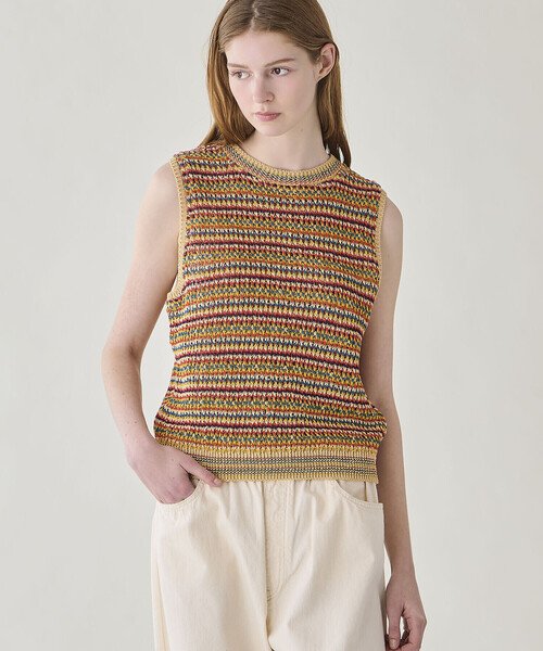 <デザイン> - クルーネックのニットベスト - ノスタルジックなマルチボーダー - レギュラーフィット <素材> - ギマコットン糸をざっくりと編み立てた清涼感あるニット - 軽量 / ドライタッチ - 長いシーズン着用が可能 ※着用、お取り扱いの際は商品についておりますアテンションタグ、洗濯ネームを必ずご確認ください。 ※モデル撮影画像は、光の当たり具合やパソコンなどの閲覧環境によって、実際の色味と異なって見える場合がございます。商品の色味は商品単体で撮影した詳細画像をご参照ください。 メーカー品番:11-262-011 COOHEM | コーヘン ブランド名は「交編 | こうへん)」に由来する造語。「交編」とは形状の異なる複数の素材を組み合わせて編み立て、新しい素材を産み出す技術を指し、「COOHEM」はこうして誕生したニットツイードと呼ばれる独自のテキスタイルを用い、まったく新しいトラディショナルウェアを表現している。すべての工程が一箇所で完結する希少なファクトリーから、日本のモノづくりカルチャーを世界に発信している。