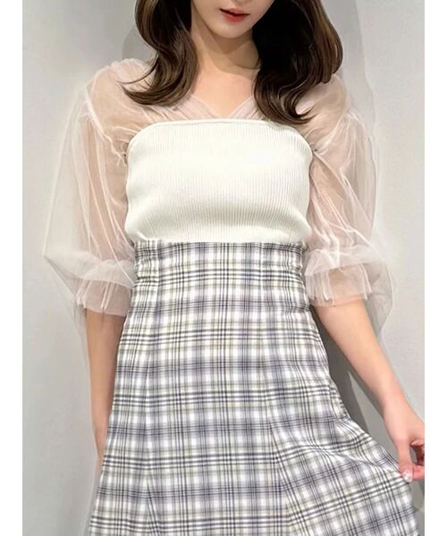 透け感のあるチュールを二重にしてたっぷりとギャザーを寄せた袖と、コルセットのようなラインを入れて体にフィットするリブニットのコントラストが華やかなニットトップスです。 チュールはデコルテ部分にギャザーを入れることで鎖骨ラインが華奢見えする効果が期待できます。 袖は内側のチュールを短くすることで外側のチュールをバルーン状に吊っています。 前切替部分はニットになだらかなカーブを付けることでよりビスチェっぽい見え方になっています。 ▼スタイリング デニムを合わせてすっきりとした着こなしにしたり、フレアスカートと合わせてフェミニンなコーディネートにしたりと幅広く着まわせます。 きらっと光るピアスやイヤリングを付けるとより艶やかなスタイリングになります。 ~~ZOZOTOWNでお買い物を楽しむ便利機能~~ ♡商品のお気に入り登録 完売カラーの再入荷時、ラスト1点の時、セール開始時に通知でお知らせします。 予約アイテムが入荷して通常販売になった時もお知らせしてくれます! ♡ブランドのお気に入り登録 新商品や再入荷、セールやクーポン情報など、 ブランドのお得な情報をいち早く受け取ることができます! ※実際にお届けする商品と仕様やサイズが異なる場合がございます。 また、生産の都合上、お届け時期が前後する場合がございます。 ※写真はすべてサンプルです。 ※肩幅が4cm小さくなります。 ※前下がりが1cm上がります。