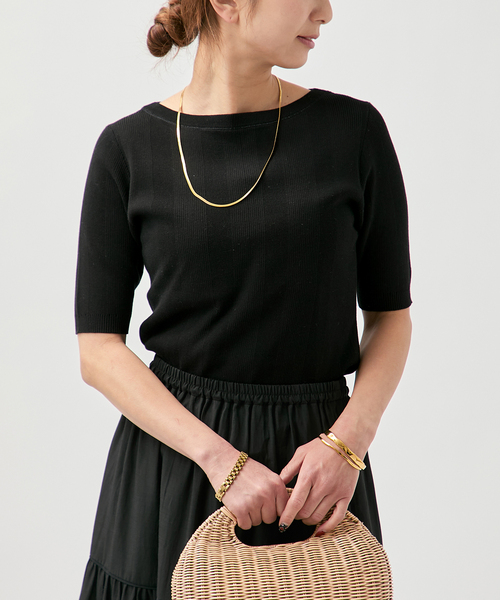 【2026SS】 VERMEIL par iena 女性らしいしなやかさを纏う、大人のためのリブニット。 上品なボートネックで、どんなシーンにも美しく。 ランダムリブが生み出すさりげない表情と、身体に程よく寄り添うフィット感が魅力のハーフスリーブプルオーバー。 リブ特有の高い伸縮性がありながら、肉感を拾いすぎない生地厚で一枚でも安心して着られる大人仕様のニットです。 上品な開きのボートネックは、デコルテをすっきりと見せてくれ、シンプルながら女性らしさを引き立てるポイントに。 定番のシルエットでジャケットやシャツのインナーとしてはもちろん、1枚着でも洗練された印象にまとまります。 お仕事からデイリーまで幅広く活躍し、色違いで揃えたくなる万能トップス。 季節の変わり目にも重宝するワードローブにひとつ持っておきたいアイテムです。 ※シリーズもございます。 ランダムRIB クルーネックロングスリーブプルオーバー(品番 26080938118010) ********************** 透け感:なし(ホワイトのみややあり) 裏地:なし 伸縮性:あり 光沢感:なし 生地の厚さ:普通 ********************** 【お取り扱い等について】 ・取り扱いについては、商品についている品質表示でご確認ください。 ・照明の関係により、実際よりも色味が違って見える場合があります。 またパソコン・スマートフォンなどの環境により、若干製品と画像のカラーが異なる場合もございます。 ・商品の色味は、商品アップ画像をご参照ください。 ・こちらの商品は、VERMEIL par iena での取り扱いになります。 直接店舗へお問い合わせの際は VERMEIL par iena店舗へお願い致します。 ブラック・グリーン着用スタッフ身長:157cm 着用サイズ:フリー ホワイト着用スタッフ身長:162cm 着用サイズ:フリー 詳細着用スタッフ身長:162cm 着用サイズ:フリー 本体:手洗い可能