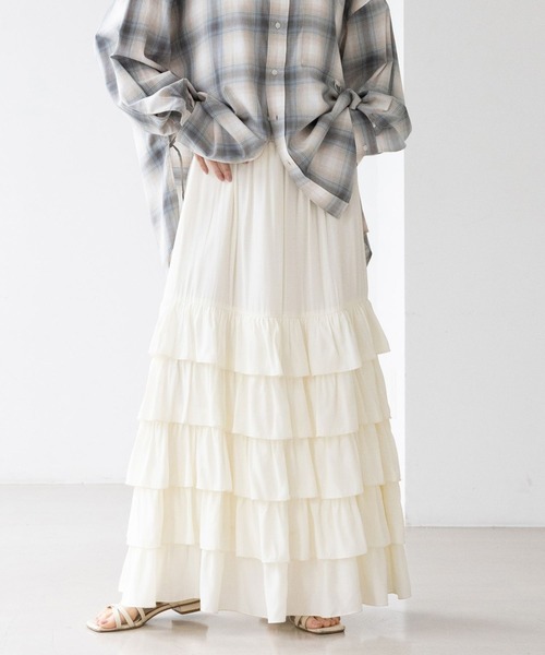 ボリュームのあるフリルが目を惹くフレアスカート。 ■おすすめの着こなし ☆カジュアルスタイルには・・・ ルーズシャツや、Tシャツと合わせるきれいめカジュアルスタイルがおすすめです。 甘めなスカートなので、ゆとりのあるメンズライク風なアイテムと合わせるのが◎です。 ☆とことん女性らしい着こなしには・・・ コンパクトカーディガンと合わせる、きれいめスタイルが◎ ボリュームのあるスカートなので、タイトなトップスと合わせることで女性らしい印象で着用いただけます。 ーーー ■ポイント フリルデザインが女性らしいスカートが登場。 無地とチェック柄のアソートなので、お好みに合わせて着用いただけます。 ボリュームのあるティアードフリルなので、フェミニンな印象に。 裾にかけてややAラインに調整し、バランスよく仕上げました。 ウエスト部分はぐるりと一周ゴム×紐付きなので、ノンストレスな穿き心地◎ 幅広いアイテムと相性が良いので、ロングシーズンお使いいただけること間違いなしです。 ■素材 さらっとした肌触りで、穿き心地抜群の混紡素材を使用。 裏地付きなので、安心して着用いただけます。