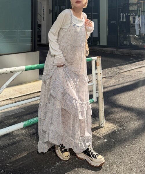 春ムード高まる小花柄フリルロングワンピ♪ ▼デザイン ・繊細な小花柄が目を惹くキャミワンピース ・段々に切り替えたティアードデザインでふんわりとしたシルエットに! ・華奢なストラップで女性らしい抜け感をプラス、長さ調節可能♪ ・動くたびに揺れる軽やかな素材感でシーズンムード高まる1枚◎ ▼コーディネート ・ロンTやシアートップスをインしてレイヤードスタイルもおすすめ! ・スウェットやニットを上から重ねてスカート風の着こなしも◎ ・デニムジャケットやカーディガン合わせでロングシーズン活躍 ※洗濯、取り扱い 洗濯:40度限度 手洗い アイロン:低温120℃まで スチームなし(あて布使用) タンブル乾燥:不可 -------------------- 裏地:あり 透け感:なし 厚さ:やや薄め 伸縮性:なし -------------------- 【商品のお気に入り登録】 お気に入りアイテムの値下げ・再入荷・在庫1点などの通知を受け取ることができます。 【ブランドのお気に入り登録】 新商品や再入荷、セール、クーポン配布などお得な情報を受け取ることができます。 ※サイト上のカラー名と、お届け商品に記載されているカラー名が異なる場合がございます。 ※商品の色味は、撮影場所や光のあたり具合などにより色味が違って見える場合が御座います。また、お客様のお使いのPCのモニター環境などにより色味が違って見える場合が御座います。予めご了承の上ご注文下さい。 ※ご注文いただいた予約商品のお届け時期の確認は、注文履歴ページより行えます。