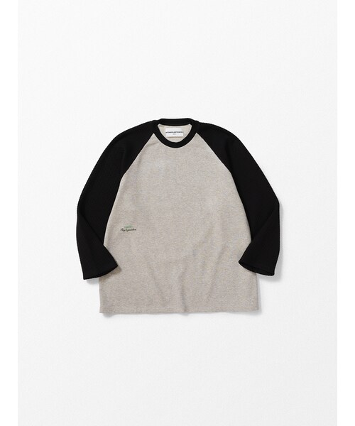 ■配色のラグランカットソー。身頃はオーガニックコットンを使用した薄手のスウェット生地、袖は太番手の糸をローゲージ機で編み立てた、ざっくりとしたラッセル編みのカットソー生地を使用。カラーだけではなく異素材を使用することで、立体感のある仕上がりとなっています。右サイドにブランドロゴがデザインされています。