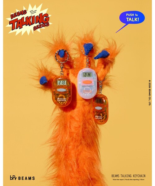 50周年 エクスクルーシブアイテム 1996年の誕生から2001年まで展開し2016年に一度復刻された、〈bPr BEAMS〉のアイコンとも言えるアイテム""BEAMS TALKING SERIES""。長きにわたり愛され続けた名作が、BEAMS50周年の節目に待望の復刻です。 シリーズとして今回初登場となるキーチェーンは、丸みを帯びたかわいらしいフォルムが特徴です。押したボタンを読み上げてくれる、ユニークなトーキング機能を搭載。当時のディテールを忠実に再現しながら、コーポレートカラーのオレンジとクリアでアップデートさせています。 90'sのムードと""今""の空気感を融合させたデザインは、手に取る人によって懐かしさや新鮮さを感じられるところも魅力の1つ。バッグに付けて楽しみたい、アニバーサリープロダクトです。 【仕様・詳細】 ・時刻のアナウンス:TALKINGボタンを押すとアナウンス ・12/24h表示切替 ・アラーム/スヌーズ機能 ・時報アナウンス機能 ・サイズ:6×4×1.3cm ※こちらは英語モデルです。 ※お届け時の電池は動作確認用です。 ※光の当たり具合やパソコンなどの閲覧環境によって実際の色味と異なって見える場合がございます。予めご了承ください。 ※複数の製品が写っている画像はイメージです。