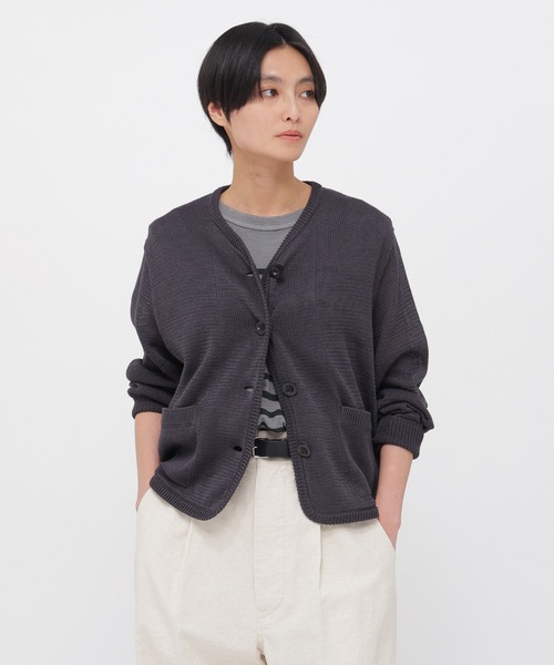 コットンに特殊なコーティングを施し、リネンのようなドライな質感とハリを加えたニットカーディガン。リネン特有の落ち感がなく、マットで安定感のある表情が特長。緩めのゲージで編み立てた身頃に、シャツテイルのようにラウンドさせた裾や、編み続きで仕上げたワイドな見返しを組み合わせたデザインが、レイヤードしたときにも映える仕上がり。※こちらはMHL.SHOP・mix.tokyo限定の商品です。※こちらはウィメンズの商品です。 ▽お気に入り登録 <商品のお気に入り登録> 完売カラーの再入荷通知や、ラスト1点の通知、セールの通知も受け取ることができます。 <ブランドのお気に入り登録> 新商品や再入荷など、いち早くブランドの情報を受け取ることができます。