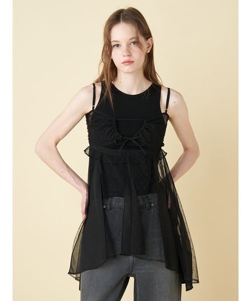 チュールとシフォンの透け感のある素材をパッチワークさせたキャミトップス。身頃にカットやギャザーなどの細かいディテールを組み合わせラグジュアリーな雰囲気に仕上げました。着用しやすい様に、ノースリリブカットトップスがセットで付いています。リブはレーヨンが入っている滑らかな質感の素材となっているため着心地も抜群です。 透け感;あり 裏地;なし 伸縮性;ややあり 光沢感;なし 生地の厚さ;薄手 ※照明の関係により、実際よりも色味が違って見える場合があります。 またパソコン・スマートフォンなどの環境により、若干製品と画像のカラーが異なる場合もございます。予めご了承ください。 商品の色味は、商品単品画像をご参照下さい。 ※商品画像はサンプルのため、色味やサイズ等の仕様に変更がある場合がございますので、予めご了承ください。