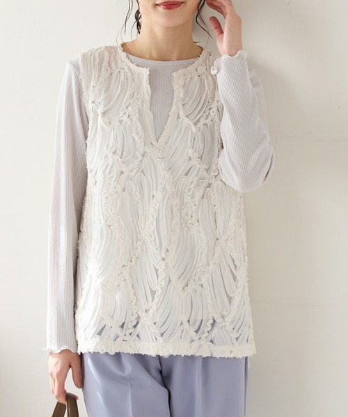 大人な抜け感 【デザイン】 立体感のある刺繍レースが目を引く、主役級デザイン。 ヒップまで隠れるゆったりめシルエットとキーネックで大人な抜け感を演出。 【素材・機能】 軽やかなチュールにほんのり透けるシフォンテープを刺繍した、デザイン性のあるレース素材。 【スタイル】 カジュアルなデニムなどはもちろん、Iラインスカートやワイドパンツなど、どんなボトムスとも好相性。 いつものコーデに合わせるだけで一気に華やかなスタイルに。 長袖、半袖、ノースリーブと、インナー次第でオールシーズン活躍。 ※裾両脇スリットあり(15cm) 品番:534-13-9950