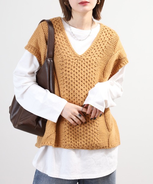 立体感のある編み目が映える深Vネックのニットベスト ■point 凹凸感のあるケーブル編みが表情豊かなこちらのニットベストは、深めに設定されたVネックラインが顔まわりをシャープに魅せます。 ゆったりシルエットで体のラインを拾いづらく、重ね着に適した一着です。 ■fabric アクリル80%とウール20%の混紡素材を使用し、柔らかな肌触りと程よい保温性を両立。 軽やかさも持ち合わせているため、春先のコーディネートに最適な生地感となっています。 ■detail ケーブルやアラン編みの伝統的なニット柄を取り入れ、立体感を強調。 深いV字のネックラインがレイヤードスタイルに抜け感をプラスし、シャツやカットソーとの重ね着に映えるデザインです。 ■silhouette ややゆとりのあるボックスシルエットで窮屈感なく着用でき、体型カバー効果も期待できます。 短すぎない着丈がバランス良く、幅広いボトムスと合わせやすいシルエットです。 ■coordinate 春の軽やかさを演出するなら、白ベースのブラウスや薄手のカットソーとのレイヤードがおすすめ。 ボトムスにはデニムのストレートパンツやテーパードスラックスを合わせて、カジュアルながらもきちんと感のある装いに。 足元はローファーやバレエフラットで女性らしさを演出しつつ、春夏らしい明るいバッグをプラスすると全体の印象が引き締まります。 気温の変化に対応しやすく、オフィスカジュアルから週末の街歩きまで幅広いシーンに活躍するレイヤードニットウェアです。 『OKシーン』 ・オフィス・街歩き・カフェ・図書館・美術館・ショッピングモール・映画館・ミュージアムショップ・公園・展覧会・ギャラリー・セミナー会場・コワーキングスペース・駅構内・空港ラウンジ・ホテルロビー・友人宅・カフェテラス・書店・プレゼント・ギフト ================== 【お買いものをお楽しみいただく為の方法】 ================== ★商品のお気に入り登録★ ・再入荷通知、ラスト1点通知、セール通知が届きます。 ★ブランドのお気に入り登録★ ・新商品や再入荷など、お得な情報を受け取れます。 Vネックベスト/knit/vest/ニットベスト/レディースベスト/春ニット/ケーブルニット/アラン編みベスト/ゆったりシルエット/重ね着ベスト/通勤ベスト/きれいめカジュアル/グレー/キャメル/春服/秋服/ケーブル編みシャツ/アラン編みシャツ/春物