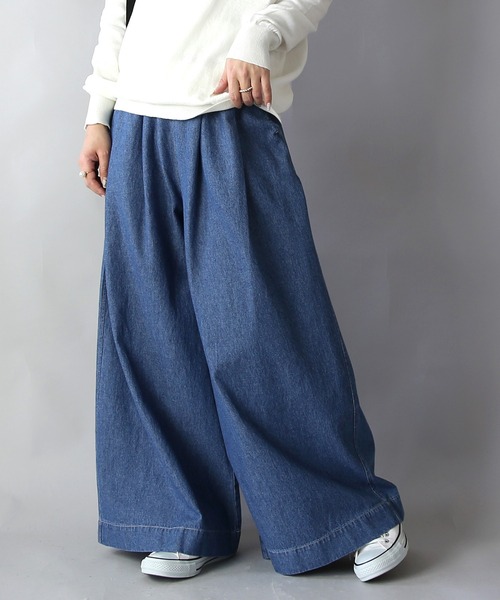 脚のラインを拾わずゆるっとラフに着こなせる。ボリューム感が可愛いタックワイドパンツ。 春夏にぴったりの軽やかなライトデニム素材を使用しています。 綿100%で肌触りが良く、ウエストゴム仕様により快適な着心地を実現。 ワイドシルエットが体型をカバーし、大人可愛いスタイルを演出します。 ポケット付きで実用性も兼ね備え、カジュアルなシーンに最適です。 ブルーとダークネイビーの2色展開で、ナチュラルな雰囲気を楽しめます。 《商品説明》 Mスタッフが着用してみました。 ◆身長:160cm 着用サイズ:M-L 普段の着用サイズ:M◆ 丈感(ウエスト穿き) : 裾位置はかかとくらい ウエスト : 大きめ ヒップ : 大きめ 太もも : 大きめ Lスタッフが着用してみました。 ◆身長:163cm 着用サイズ:M-L 普段の着用サイズ:L◆ 丈感(ウエスト穿き) : 裾位置はかかとくらい ウエスト : やや大きめ ヒップ : 大きめ 太もも : 大きめ 《生地の透け感》 なし 《便利な機能のご紹介》 ◇商品のお気に入り登録 完売カラーの再入荷通知、ラスト1点の通知、セールの通知を受け取ることができます。 ◇当ショップのお気に入り登録 新商品&再入荷等、イベント等のお得な情報を受け取ることができます。