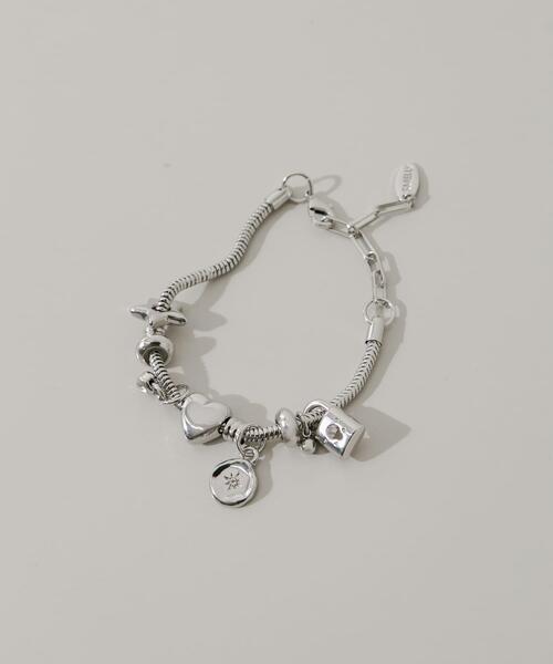 【じゃらっとチャームがキュート】 ●様々なモチーフのチャームを贅沢にあしらったデザイン ●艶やかなメタル素材で子供っぽくならず洗練された印象に ●程よく太さのあるチェーンが、手首を華奢に見せつつこなれ感を演出 手元にパッと華やぎを添えてくれるチャームブレスレットです。 色々な形のモチーフがじゃらっと連なるデザインは、見ているだけでも心ときめく可愛らしさ。 ボリューム感はありつつも、同じカラーのメタル素材でまとめているのでごちゃごちゃせず大人のカジュアルスタイルにすっと馴染んでくれます。 動くたびにチャームがシャラシャラと揺れ、ふとした手元のしぐさも魅力的に見せてくれますよ。 【2026 Spring/Summer】【26SS】 ※メッキ製品(特に銀メッキ)は変色しやすいため、こまめなお手入れで防止してください。長期放置やスプレー香料などの同時使用は、特にお避けください。 ※メッキ製品は、アレルギー体質の方や体調が低下している方など、かぶれることがあります。肌に異常を感じた時はご使用をお止めいただき専門医にご相談ください。 ※アクセサリーは壊れやすいものです。取り扱いに注意していただき大切にご使用いただけるようお願い申し上げます。 総重量 : 約15.5g ※商品画像は、光の当たり具合やパソコンなどの閲覧環境により、実際の色味と異なって見える場合がございます。予めご了承ください。 ※商品の色味の目安は、商品単体の画像をご参照ください。 ▼お気に入り登録のおすすめ▼ お気に入り登録商品は、マイページにて現在の価格情報や在庫状況の確認が可能です。 お買い物リストの管理にぜひご利用下さい。 -