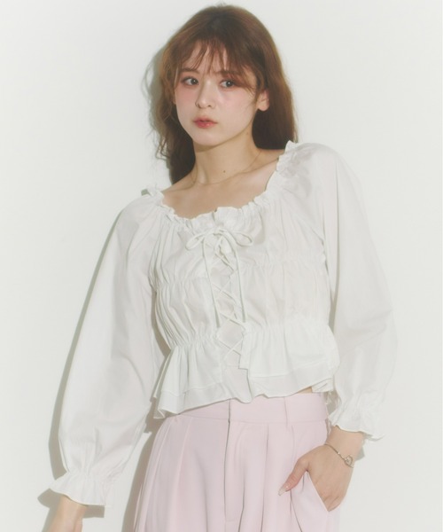 気品ある甘さを、編み込んで レースアップディテールが印象的なブラウスを、 洗練されたバランスで仕上げました。 フェミニンな要素を効かせながらも、 軽やかに着られるデザインです。 素材はコットン100%の生地を採用。 軽やかさの中にほどよいハリ感があり、 立体感のあるフォルムを美しくキープします。 首元はスクエアネックのような デザインがデコルテをすっきり見せ、 ほんのりペプラムのように広がるシルエットが やわらかな女性らしさを演出してくれます。 フロントのレースアップはご自身で調節可能! きゅっと結んでコンパクトに、 少し緩めて抜け感を出すこともできます。 袖口にもギャザーを施し、 細部までときめきを宿しました。 カラーは、black / white / blue / pink の4色展開。 ベーシックから華やぎカラーまで、 幅広いスタイリングに対応します。 ハイウエストボトムと合わせれば ペプラムラインがより引き立ち、 タイトスカートと合わせれば、 よりレディな雰囲気に仕上がります。 春から秋までロングシーズンで 大活躍してくれるブラウスです。 ■公式 Instagram【@olu.myself】 新作やキャンペーン情報などを発信していますˎˊ˗ ぜひお買い物の参考にしてください。