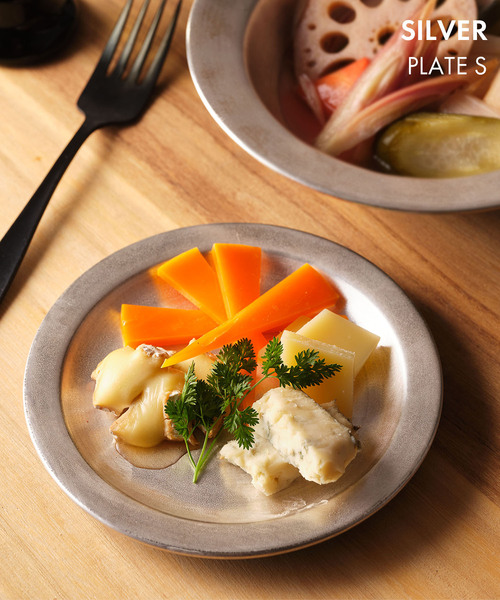 職人の技が生み出す繊細な輝きを、現代の食卓に溶け込むよう洗練された表情に仕上げた「銀彩釉薬」の食器シリーズ。 柔らかな光沢をまとった銀彩は、光の角度によってさりげなく表情を変え、落ち着いた中にもモダンな印象を添えます。 料理の彩りを美しく引き立てる控えめな輝きは、和洋問わずどんなテーブルにもすっと馴染み、日常使いはもちろん、ゲストを迎える特別なシーンでも上品な存在感を放ちます。 手仕事ならではの質感と、シンプルなシェイプとニュートラルな色合いで、現代的なライフスタイルにもフィットするデザインに。 トレンド感のあるミニマルなデザインと、伝統技法の深みを併せ持つテーブルウェア。 銀彩は使うほどに色味が落ち着き、少しずつ風合いが深まっていく器。 毎日の食卓になじみながら自分だけの表情に育っていく、経年変化を楽しめるアイテムです。 手に取りやすい14.5cmサイズのプレート。 取り皿としてはもちろん、副菜やサラダ、フルーツ、焼き菓子などの盛り付けにもぴったりです。 内径が広く見た目より使いやすく、ティータイムのケーキ皿や、薬味・前菜の盛り付けにも活躍。毎日の食卓で自然と手が伸びる、使い勝手の良い一枚です。 【ご購入頂く前に】 ・土ものの自然な風合いを大切に、一品一品を手づくりしています。そのため表情や釉薬の垂れ方ひとつひとつ全て異なります。 ・製品の特性により、釉薬にムラがございます。予めご了承の上、お買い求めください。 ※貫入や釉薬の結晶が見られる場合があります。水、お湯等に浸した場合、変色することがありますがうわぐすり(釉薬)の特徴ですので品質には関係ありません。 【目止めについて】 食器は土からできているので水分を含みやすく、油分や汁気が染み込みやすいです。 着色や油染みを少しでも抑え、長く綺麗にお使いいただくため、使い始める前に目止めをお願いいたします。 《目止め方法》 1.鍋に器と米のとぎ汁と器が被るくらいの水を入れます。 ※米や米粉、小麦粉でも代用できます。 2.20分ほど弱火で煮ます。 ※破損につながりますので沸騰させないでください。 ※カップやボウルなど深さがあるものは下向きにしないでください。空気の膨張により破損につながりますので、必ず上向きにして水に浸してください。 3.鍋ごと冷まします。 4.器を洗って布巾などで水気をとり、風通しの良いところで半日~1日程度乾燥させてください。 中まで乾ききっていない場合、カビの原因となりますので、しっかり乾燥させてください。 【ご使用上の注意】 ・初めてのご使用の際には、必ず水かぬるま湯で洗ってください。 ・お使いになった後の汚れは早めに落とし、よく乾かしてから保管をしてください。 ・底面処理をしておりますが、もし裏返してざらざらしていたら、目の細かい紙ヤスリで軽くこすりなめらかにしてください。 ・研磨剤、研磨剤入りの洗剤、クレンザー、金属たわし等を使用され強くこすると表面に傷がつくことがありますので、ご使用は避け、柔らかいスポンジで洗ってください。 ・からだき、直火でのご使用はお避けください。 ・強い衝撃や急激な温度変化は、ヒビ・カケなど破損の原因となりますので、お避けください。万一、ヒビ・カケなど破損した場合は、破片などで怪我をしないよう充分にご注意ください。 ・テーブルがキズつく事がありますので器を引きずらないようにしてください。 ・銀彩は酸と反応しやすいため、酸っぱい料理を長く置きっぱなしにしないでください。 ・銀彩の戻し方は銀磨きクロスでやさしく磨いてください。 ・漂白剤使用不可。 ・長時間のつけ置きはお避けください。