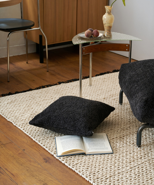 ※こちらはカバーのみの販売です。中材は別途お買い求めください。 くるくるとした立体的な糸で凹凸のある表情が特徴のブークレ素材を使用した、上質感あふれるクッション。 シンプルなブラックカラーが空間を引きしめ、アクセントをプラスします。 落ち着いた色味はモダンからナチュラルまで、どんなインテリアにも自然に調和し、ソファに置くだけで、空間をさりげなく格上げします。 季節を問わず使える、洗練されたクッションです。 【洗濯】○ 【ドライ】× 本体:洗濯機洗い(弱)