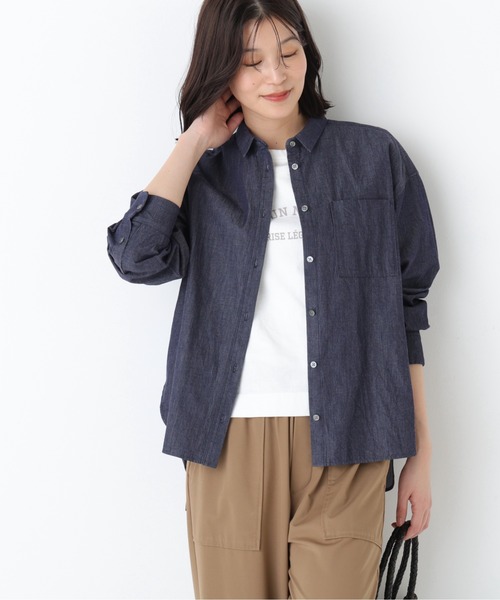 大人カジュアルに決まるデニムブラウス 【デザインのポイント】 human womanらしい台襟付き小さめシャツカラーのブラウスです。 肌離れ感あるボックスシルエットの全開き仕様なので羽織りとしても着まわせます。 袖口はカフス仕様なのでロールアップしてもニュアンスある、洗いざらした軽いデニムの心地良さを感じるトップスです。 【素材のポイント】 4ozという軽い目付のご自宅で色落ちしづらい反応染めデニムを使用しています。 【おすすめコーディネート】 後ろ着丈がやや長めなので細身パンツやスカートとも好相性です。 夏まで活躍する素材感なので、夏小物やカラーボトムと合わせて爽やかなスタイリングが楽しめます。 【お買いものをよりお楽しみいただく為に】 ■商品のお気に入り登録 再入荷・残り1点・セールの通知を受け取ることができます。 ■ブランドのお気に入り登録 新商品・再入荷/タイムセールやクーポンなどの ブランドの情報を受け取ることができます。 ------------------------------------------- 【human woman】 1998年よりスタートした”フレンチトラッド”をベースにした大人な女性のためのカジュアルブランド。 素材や縫製にもこだわってつくられた上質な日常着は、長い時間大切にお使いいただけるようにお作りしています。 約20年の歴史の中で、「数年着続けても安心感があるお洋服」と多くの方に高いクオリティを認められてきました。 ベーシックなアイテムにさりげなく加えたトレンド感で、「私らしいカジュアルスタイル」を見つけてみませんか。 「カジュアルが好き」「少しだけトレンドも取り入れたい」 「大切に着たい」「私らしくいたい」そんな思いをかなえるお洋服をhuman womanでは提案しています。 -------------------------------------------