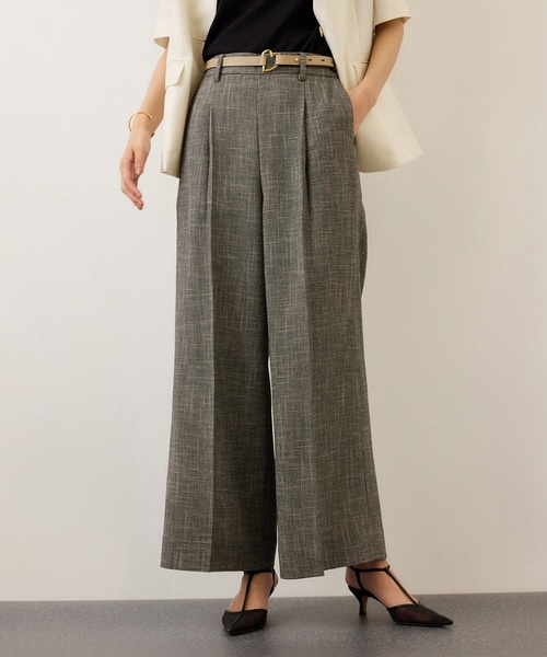 メッシュのように通気性がよく、真夏でも涼しく快適。ストレスフリーで楽々、美脚見えワイドパンツ 【デザイン・シルエット】 ワンタックを施すことで立体的なシルエットになるワイドパンツ。 腰まわりは自然にカバーしながらもすっきりと見える絶妙なシルエットに仕上げました。脚をまっすぐ長く見せるパターン設計で、美脚効果も期待できます。 後ろゴム仕様と横ファスナーの組み合わせにより、着脱はスムーズでストレスフリー。 程よくゆとりのシルエットで、カジュアルからきれいめまで幅広いスタイルに合わせやすく、日常のシーンを選ばず活躍します。 【おすすめのスタイリング】 同素材のブラウスやブルゾンとのセットアップが特におすすめ。統一感のあるコーディネートで、通勤やお出かけも品よく決まります。 【素材】 清涼感のあるドライタッチなカラミ素材を使用。 通気性がよく、蒸し暑い季節も快適です。レーヨンのほどよいツヤ感と落ち感が柔らかな印象を演出。さらにポリエステル高混率でシワになりにくく、長時間の着用でも美しく・綺麗な印象が続きます ---------------------------- 透け感:ややあり 裏地:ネイビー(40)のみあり 伸縮性:なし 光沢感:なし 生地の厚さ:中間 ポケット:あり 開き方:横ファスナー 洗濯:手洗い可能 ---------------------------- 【モデル情報】 モデル身長:175cm 着用サイズ:38 【カラミ織り シリーズ】 同素材のデザイン違いでセットアップでも着られる カラミ織りタックナロースタンドブラウス(品番:GGH26150) カラミ織りワンタックワイドパンツ(品番:GGS26120) カラミ織りドルマンスリーブショートブルゾン(品番:GGL26060) がございます。 ※画像の商品はサンプルです。実際の商品と仕様、加工、サイズが異なる場合がございます。 ※撮影場所やライティング、お使いのモニター環境によって色の見え方が異なる場合がございます。 ※商品のカラーは画像の色味をご参照ください。動画は仕様説明のため、色味が実物と異なる場合がございます。