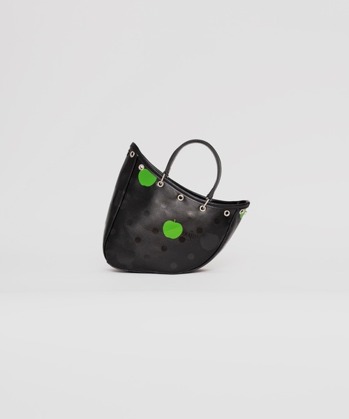 『THE BEATLES × COMME des GARCONS」によコラボレーションを代表するデザインである「ボート型」のBAGはブランドを象徴するアイコンバッグの一つ。 左右アシンメトリー(非対称)となったコム デ ギャルソンらしい独創的なデザインでありながらも平らな底によりしっかり安定する形状が特徴となっています。素材には光沢感のあるブラックのシンセティックレザー(合皮)を使用した高級感のある質感に更にブラックのドット(水玉)を重ねてプリント。 更にビートルズを象徴するモチーフである「APPLE(アップル)」のグラフックをグリーンとブラックで全面にプリント。特徴的な形状に個性的なプリントによるデザインながらも、日常使いにピッタリなサイズ感でデザインされたコム デ ギャルソンならではのコラボレーションバッグとなっています。(高28cm×幅24cm×マチ10cm) The "boat-shaped" bag, a signature design from the "THE BEATLES x COMME des GARÇONS" collaboration, is one of the brand's most iconic bags. It features an asymmetrical design that is characteristic of COMME des GARÇONS, but its flat base ensures stability. Crafted from glossy black synthetic leather, it has a luxurious feel and is printed with black polka dots. It also features an "APPLE" graphic, the Beatles' iconic motif, printed all over in green and black. While its distinctive shape and unique print make it a collaboration bag unique to COMME des GARÇONS, its size is perfect for everyday use.