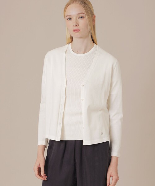 【接触冷感】【ウォッシャブル】【着用推奨シーズン:春・夏】 <素材説明> 紡績した極細の強撚糸を更に追撚した糸を使用し、シャリ感が出しながら綺麗な編み目に仕上げた素材です。 <機能性> 接触冷感(冷感は持続するものではありませんので予めご了承ください。) <デザインポイント> 16ゲージで繊細に編みたてたケーブル柄がポイントのカーディガンです。ジャケットにも合わせて着用出来るシャープな衿元で、トップスやワンピースなどの羽織としても汎用性の高いアイテムです。同素材のプルオーバー(品番:G5N16715)とアンサンブルで着用いただけます。