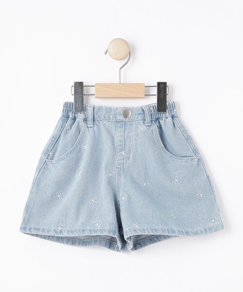 【デザイン】 刺繍リボンが散りばめられたライトデニムのショートパンツ。 ウエストゴム仕様にベルトループと飾りボタンを配し、前ポケットで実用性も確保。 【素材】 ライトウェイトのデニムに刺繍でリボン柄を表現。 程よいハリがありつつ軽やかで、ウエストゴムでフィット感のある着心地が特徴です。 【仕様】 ・ポケット数:横×2 後ろ×2 ・ウエスト後ろゴム ・裏地なし ※照明の関係により、実際よりも色味が違って見える場合があります。また、パソコン・スマートフォンなどの環境により、若干製品と画像のカラーが異なる場合もございます。 店舗へのお問い合わせ商品番号:122-65006 ●製品寸法: 10(100cm):W38~44cm H68cm 股下4cm 前股上21cm 渡り幅23cm 裾幅24cm 11(110cm):W40~46cm H71cm 股下5cm 前股上23cm 渡り幅24cm 裾幅25cm 12(120cm):W42~48cm H74cm 股下6cm 前股上24cm 渡り幅25cm 裾幅26cm 13(130cm):W44~50cm H77cm 股下7cm 前股上25cm 渡り幅26cm 裾幅27cm 14(140cm):W46~52cm H80cm 股下8cm 前股上26cm 渡り幅27cm 裾幅28cm 15(150cm):W48~54cm H82cm 股下8cm 前股上27cm 渡り幅28cm 裾幅29cm 備考: