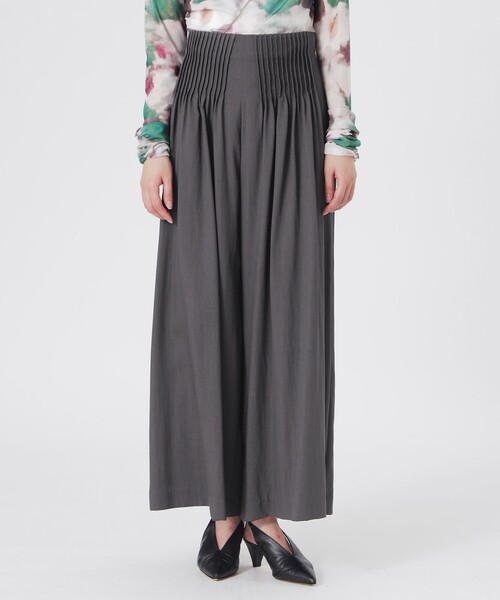フロントのピンタックが特徴的で、存在感のあるワイドパンツ。 【素材】 ナチュラルな風合いが特徴のツイル素材を使用。 生地をやさしくほぐす洗い加工を施すことで、自然なシワ感と膨らみが生まれ、ヴィンテージライクでこなれた表情の生地です。 落ち感がありながらも軽やかで、ナチュラルな雰囲気の中に上品さのある素材です。 ご自宅で手洗い可能なイージーケアも嬉しいポイント 【シルエット/デザイン】 フロントに細かなピンタックをたっぷりと入れた、存在感のあるワイドパンツ。 腰まわりはすっきりと見せながら、裾に向かって自然に広がるシルエットで、縦のラインを強調します。 分量感がありながらも落ち感のある素材を使用することで、広がり過ぎず大人っぽい印象に仕上げています。 【スタイリング/その他】 シンプルなトップスを合わせるだけで、スタイリングに奥行きが生まれる一着。 コンパクトなニットやカットソーはもちろん、シャツを合わせたきれいめな着こなしにも好相性です。 デイリーから少しきちんと感を出したいシーンまで、幅広く活躍します。 【お手入れ方法】 こちらの商品は、手洗いでのお洗濯が可能です。 ━━━━━━━━━━━━━━━━━━━━━━━━━━ お買い物をお楽しみ頂くために <商品のお気に入り登録> 完売カラーの再入荷通知など、お得な情報をお届けします。 <注意事項> この商品はサンプルでの撮影を行っています。 実際の商品とイメージが異なる場合がございます。 撮影環境により、光の当たり具合で色味が違って見える場合があります。あらかじめご了承下さい。