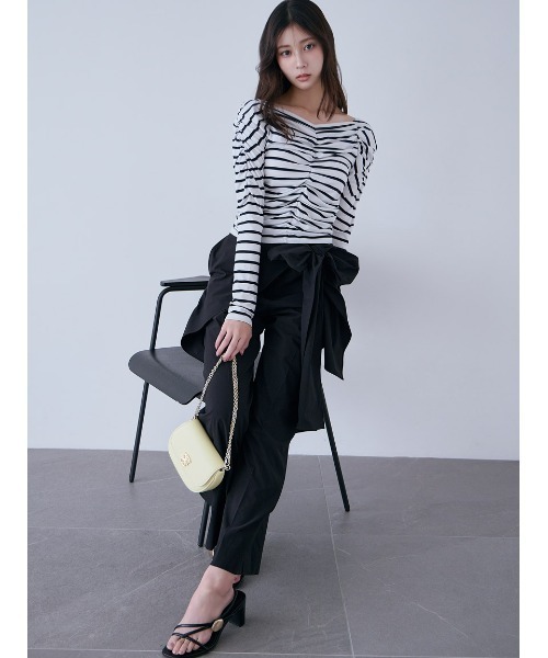 【ビッグリボンにしたり、フリルにしたり、アレンジ可能な2WAYリボンデザインパンツ】 【Design/Styling】 センタープレス入りのストレートワイドパンツの両サイドに、太幅の共布リボンを垂らしてドレープ感を加えたリボンデザインパンツです。サイドの太幅長めのリボンは、フロントでリボン結びや固結びでアレンジ可能。さらに、リボンのサイドにボタンが付いているので、パンツのボタンホールに固定して華やかなラッフルフリルのようにあしらうことも可能です。ウエスト位置はやや太幅ですっきりとしており、美シルエットに着こなしていただけます。ボリュームのあるオフショルタックバルーンブラウス(SWFB261168 ) 合わせのドレッシーなスタイリングにも。サイドにポケット付き。お尻側は飾りポケットです。 【Fabric】 グレー、シャリ味のあるマットで大人な印象のブラック、落ち感のあるしなやかな生地のグレイッシュなベージュの3色展開。 透け感:なし 裏地:なし 伸縮性:なし 光沢感:なし 生地の厚さ:普通 【おすすめ骨格タイプ】 ■骨格ストレート ■骨格ナチュラル ※照明の関係により、実際よりも色味が違って見える場合があります。 またパソコン・スマートフォンなどの環境により、若干製品と画像のカラーが異なる場合もございます。予めご了承ください。 商品の色味は、商品単品画像をご参照下さい。 ※商品画像はサンプルのため、色味やサイズ等の仕様に変更がある場合がございますので、予めご了承ください。
