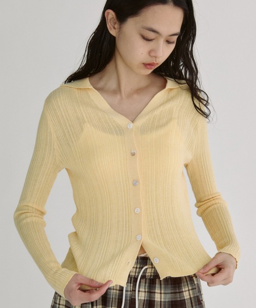 抜け感をつくる スキッパーシアーニット ■デザイン 首元をすっきり見せてくれるスキッパーデザインのリブシアーニットカーディガン 程よくコンパクトなサイズ感で、丈は腰骨あたりまでのミドル丈 インでもアウトでもバランスよく決まるシルエット ホワイト、ネイビーのベーシックカラーに加え、スタイリングの主役になるイエローの3色展開 ■素材感 程よい透け感のある軽やかなシアーニット素材 やや薄手でロングシーズン着用しやすい質感 さらっとしたタッチで春先にも取り入れやすい風合い ■スタイリング ボタンを閉じてトップス風に、開けて羽織りとしても活躍 デニムやスラックスに合わせてシンプルに着こなすのはもちろん、 インナーをのぞかせたレイヤードもおすすめ インでもアウトでも決まりやすく、幅広いボトムと相性の良い一枚 --------------------------------- 透け感:あり 裏地:なし 伸縮性:あり 光沢感:なし 生地の厚さ:やや薄手 --------------------------------- ※詳しいお手入れ方法は商品タグをご参照ください。 「duei / デュイ」 "sensual, mode, daily, mix" しなやかさと自由なニュアンスを センシュアルな要素をプラスして 日常を飾り立てる 気分が高まる 洗礼された自分らしさを表現できる服を提案します 【商品のお気に入り登録】 完売カラーの再入荷通知やラスト1点の通知 プライスダウンの通知も受け取ることができます。 ぜひご登録ください◎ 【ブランドのお気に入り登録】 新商品や再入荷など、 ブランドの情報をいち早くお知らせします! ぜひご登録ください◎ ※ATTENTION※ ・屋外の光や照明の当たり具合で、実際の商品の色味と カラー別画像の色味に若干の違いが発生する場合がございます。 ・詳細画像と併せてご確認の上、ご注文いただきますようお願い致します。