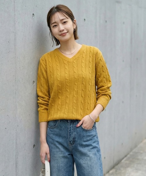 春向けの軽やかな綿タッチ素材を使用した、薄手のケーブル編みニットトップス。厚みを抑えたスッキリとした生地感でホッコリ見えせず、Vネックのシャープさとストレートシルエットにより洗練された印象に仕上がります。ゆとりはありつつも身幅を広げすぎない設計とやや長めの丈感で、自然な着痩せ効果が期待できる一枚です。 ハリのある素材が身体のラインを拾いにくく、丸みや厚みを強調しないのもポイント。長めの袖丈とVネックの縦ラインが全体をスラリと見せ、ケーブル編みでもスタイリッシュに着こなせます。裾は締め付けのないリブ仕様で、ストンと落としても軽くブラウジングしてもバランス良く決まります。 表面の凹凸感がコーディネートに立体感を生み、シンプルなボトムスを合わせるだけでサマになる時短アイテム。春を中心にロングシーズン使え、手洗い可能で毛羽立ちにくい扱いやすさも魅力です。挑戦しやすい価格で、これまでケーブル編みを敬遠していた方にもおすすめです。 【その他の仕様】 ◆着用時期:夏以外 ◆サイズ感:適度にゆとりのあるサイズ感 ◆丈感:ヒップが隠れる程度 ◆シルエット:ストレート ◆首元:Vネック ◆肩幅:広め ◆アームホール:やや広め ◆袖幅:やや広め ◆袖丈:長袖 ◆袖口:リブ編み ◆袖のたくし上げ:可能 ◆厚み:やや薄手 ◆柔らかさ:ハリ感の中にしなやかさが共存 ◆肌触り:綿ニットのようなサッパリ系 ◆着用ジワ:できにくい ◆毛羽立ち:できにくい ◆伸縮性:あり ◆光沢感:なし ◆スリット:なし ◆ボタンやファスナー:なし ◆手洗い:可能 ◆アイロン:不要 ◆スチーマー:使用OK 【お色について】 ◆ネイビー:春らしさのある明るめのネイビー。目立たない程度に若干ナス紺系のお色です。 ◆アイボリー:真っ白よりも少し柔らかな深みを持つ、肌馴染みの良い発色。微々たるクリーム色素がありつつ着るとそれが目立たないお色です。 ◆ディープイエロー:和からしのような深みのあるマスタード系イエローカラー。明るさはありますが、派手にならず大人っぽいお色です。