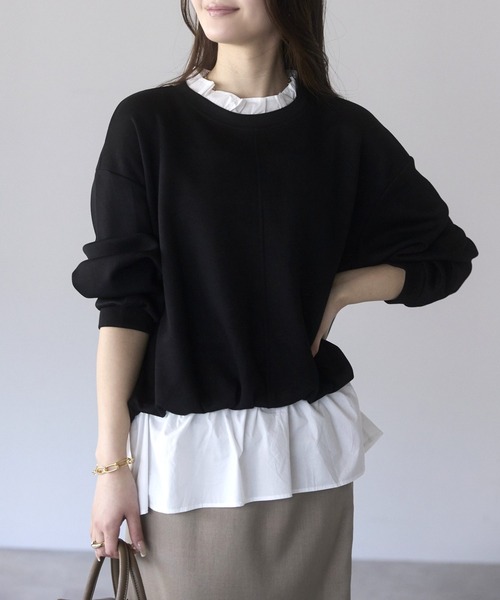 ◆1枚でおしゃれ見えする◆ 人気の異素材ドッキングのレイヤード風プルオーバーをリリースしました。 ご旅行、デートにオフィスカジュアルに大活躍してくれるアイテムです。 ◆Design◆ 襟元と裾にあしらった白の綿フリルがさりげない甘さをプラス。 カットソー素材なので着心地は楽なのに、ブラウスを重ねたようなきちんと感も演出できます。 程よくゆったりとしたシルエットで体型カバーも◎ デニム合わせでカジュアルに、マーメイドスカートやスラックスと合わせてきれいめスタイルにも。 ♪ レイヤードいらずの時短トップス ♪甘すぎない大人フェミニン ♪ロングシーズン着用可能 ◆Size◆ フリーサイズ着丈:57.5cm ◆Color◆ ブラック / カーキ / グレーはややブルーがかったニュアンスカラーです。