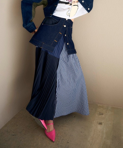 MARECHAL TERRE / デニム&プリーツスカートデニム×ストライプ×プリーツの異素材切替で360度大人可愛いスカート。 腰回りのデニムとボタンがトレンドライクなデザインでスッキリ見えも叶います。 オールシーズン着られる生地感です。 -------------------------------------- 透け感:なし 裏地:なし 伸縮性:なし ケア方法:ドライクリーニング ※お洗濯の際は洗濯表示を必ずご確認ください。 -------------------------------------- <コーディネートmodel172cm> <詳細画像model162cm> [MARECHAL TERRE / マルシャルテル] 着る人を「凛」とさせる服作りをコンセプトに「Traditionalを遊ぶ」、トラッド・カジュアル・エレガント・モードを少しだけ捻ったデザインで30代のリアルクローズを提案。 着る人が心を動かされる物作り、シンプルで心地よく女性に共感を得ることを服作りのVISIONに。