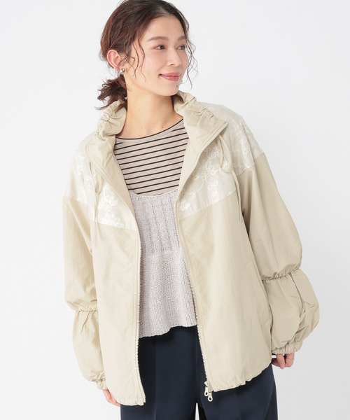 カジュアルながらも女性らしさ◎ 幅広いアイテムと合わせやすいレースシャーリングブルゾン ーーー 【素材】 柔らかいナイロン素材を使用。 肩周りにレースをあしらうことでカジュアルになり過ぎず、女性らしさも。 【デザイン】 春アウター定番のナイロンブルゾン。 素材ならではのカジュアルな印象がありながらも、肩周りにレースをあしらうことで女性らしい印象もプラスします◎ 着丈に前後差があるので、さりげなくヒップを隠してくれるのも嬉しいポイント。 カジュアルにも綺麗めにも合わせやすい一着です。 アウター ブルゾン レース ーーー 【スタイリング】 パンツスタイルのカジュアルな着こなしはもちろん、スカート合わせの女性らしい着こなしも◎ ワンピースに合わせてほんのり甘辛な印象でご着用いただくのおおすすめです。
