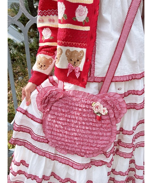 みんな大好き!!フリルをあしらったシルエットバッグ。今回はテディの顔のかたちを形取ったギンガムチェックのポシェット。 表側の部分にはギンガムチェックのフリルをふんだんに敷き詰めたキュートな仕上がり。テディの耳にもフリルをあしらって可愛らしく。 左サイドには、ピンク色のローズとロゼ色のラズベリーの実のニットモチーフを飾ってアクセントに。 しっかりとした作りで、なかにものを入れてもテディの顔がしっかりとキープされるところもポイントです。 裏側のローンにはキルティング加工を施して。ふんわり中わた入りで肌あたりもよく優しい使い心地に。そして裏側にはスナップボタンの外ポケットも付いています。 本体の入りぐちのところにも、内側にスナップボタンが付いていて留められます。 内側にはちゃんと内ポケットも付いていてちょっとした小物も小分けで収納できます。 ショルダー部分も同じギンガムチェックを使用しているところも可愛いポイントです。 コーディネイトのワンポイント使いとしても。 ギンガムチェックは、お洋服と同じ、上質な60/_糸を使用して織り上げたオリジナルものを使用。お洋服にも合わせやすくマッチします。 上品なソフトタッチと、オリジナルティある柄ピッチを表現した特製ギンガムはちいさな格子柄でクラシカルな雰囲気に仕上げてくれています。春らしい優しい「ラベンダー」新色に加えて春カラーをお楽しみいただけます。