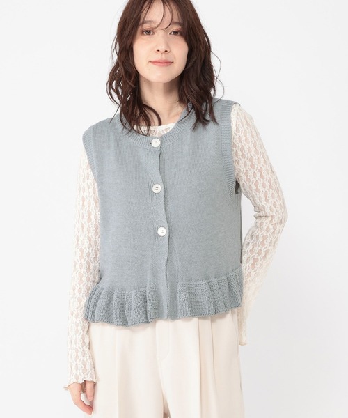 大人可愛い裾フリルデザイン 嬉しい前後2WAY仕様のニットベスト ーーー 【素材】 綿タッチで柔らかな肌触りが特徴の素材を使用。 着心地の良さも特徴です。 【デザイン】 5ゲージで作成されたダブルフロント仕様のニットベスト。 ペプラムシルエットの裾フリルがアクセントの大人可愛いデザイン。 甘くなりすぎないフリル丈や分量バランスにこだわっています。 前後2WAY仕様なので、幅広いスタイリングが楽しめるのも嬉しいポイントです。 ーーー 【スタイリング】 レースカットソーやシャツにレイヤードしていただくのがおすすめ。 すっきりとした着丈感なので、ワイドパンツとも好相性です。
