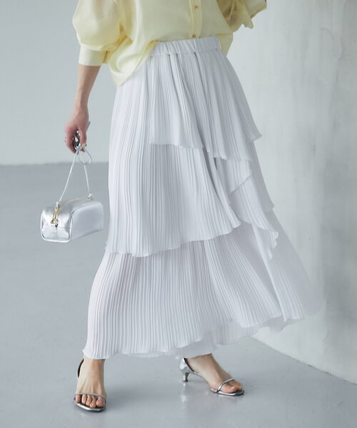 一枚で着映える!コーデが華やかになるスカート ●デザイン ランダムなイレギュラーヘムが華やかな印象にしてくれるティアードスカート。 贅沢に使用した生地にプリーツをかけることで広がりすぎないシルエットに。 ウエストALLゴムと内側のドロストでサイズ調整が可能で、楽な履き心地。 透け感の気になる腰回りのみ部分的に裏地を使用し、重さを軽減させて作りました。 歩く度に揺れる女性らしいシルエットが魅力のスカートです。 透けにくいポリエステルのジョーゼット素材を使用し、 しわになりにくく、手洗い可能で扱いやすい1枚です。 ●ポイント ・ふんわり揺れる裾で女子力UP ・透けにくく、扱いやすい素材 ・一枚で着映える ・シーズン問わず着用が可能 ●おすすめのコーディネート タイトなトップスはもちろんデザインのあるブラウスなどとの着こなしもおすすめ。 スニーカーでカジュアルに合わせたり、パンプスできれいめに合わせたり、様々なテイストとマッチ。 夏はコンパクトなTシャツ合わせできれいめカジュアルスタイルにも。 洗濯方法:手洗い 透け感:ややあり 光沢:ややあり 裏地:腰回りに部分的にあり 生地の厚さ:ふつう 伸縮性:ややあり ウエストゴム:バックゴム仕様 ファスナー:なし ポケット:なし ▼ブログで詳しくご紹介▼