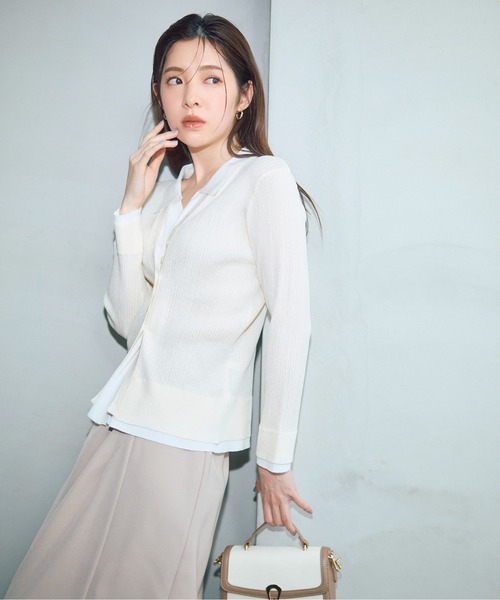 配色デザインが目を引く、一枚でサマになるレイヤード風リブニット。 襟と前立ての配色が顔まわりを明るく、上品な印象に見せてくれます。 細めのリブが縦ラインを強調し、スタイルアップ効果を期待。前開きボタンのため、 トップス風にも、ボタンを開けて抜け感のある着こなしも楽しめます。 甘さを抑えたコンパクトな襟で、キレイめにもカジュアルにも着回せるデザイン。 体のラインを拾いすぎない程よいフィット感で、女性らしさと上品さを両立した一枚です。 <素材> シアー素材を使用しています。 <詳細> 仕様・前ボタン 裏地・なし 透け感・ややあり / 光沢・ややあり / 伸縮性・あり 生地の厚さ・薄手 ※モデルの着用画像の場合、光の当たり具合により、実際の色味と異なって見えることがございます。 色味は、商品単体の画像をご参照ください。 <商品のお気に入り登録> お気に入りアイテムの値下げ・再入荷・在庫1点などの通知を受け取ることができる 便利機能ですので気に入ったアイテムはお気に入り登録がおすすめ! <ショップのお気に入り登録> 新商品や再入荷、セール、クーポン配布などお得な情報を受け取ることができます。 ●撮影はサンプル商品で行っている為、仕様とサイズが異なる場合がございます。 ●スタジオ及び屋外で撮影した着用画像は、光の当たり具合で色味が違って見える場合があります。予めご了承ください。