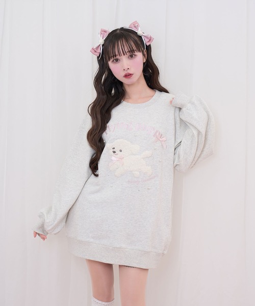 犬のアップリケがキュートなスウェット♡リボンやパールの装飾でガーリーにまとめたアイテムです♬ ビッグシルエットでデイリーに着回しやすいのも嬉しいポイント◎