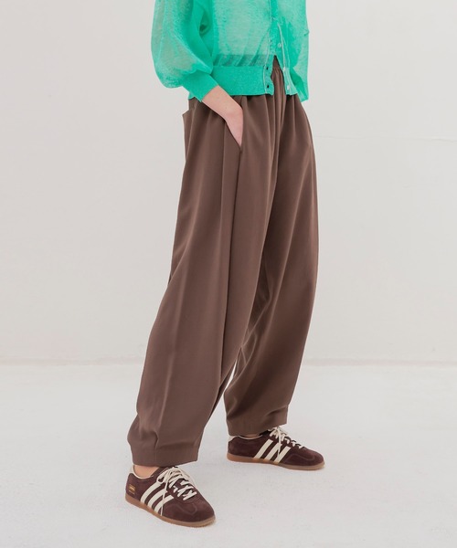■DESIGN 二重織ならではのふくらみと反発感を活かした、立体的なフォルムのタックバブルパンツ。 丸みのあるシルエットが、モードなバランスを演出。 ウエストはオールゴム仕様で、内側のドローストリングによりサイズ調整が可能。 フロントタックの奥には、接ぎを活かしたシームポケットを配し、機能性もプラス。 素材には、表面にシボ感のあるヴィンテージクレープを使用。 さらりとしたタッチで肌離れが良く、シワになりにくいため、デイリーはもちろん旅先にも最適。 同素材のジャケットとのセットアップスタイルもおすすめです。 --------------------------- 透け感:なし 裏地:なし 伸縮性:なし ケア方法:手洗い可 ※お洗濯の際は洗濯表示を必ずご確認ください。 ---------------------------