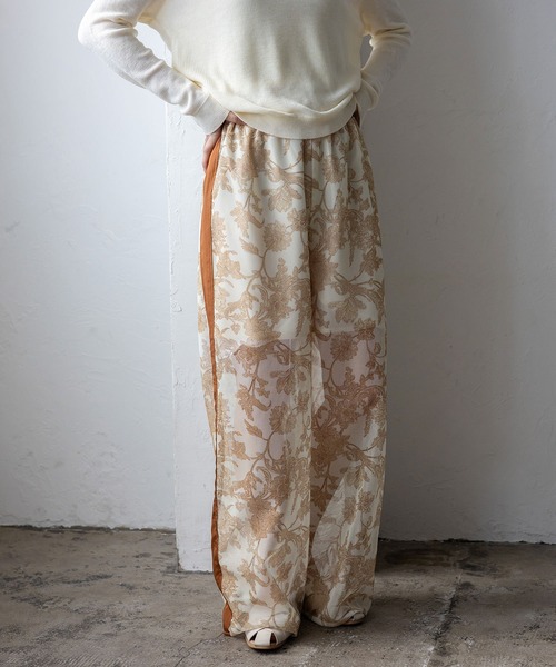 【デザイン】 フラワーシアーメッシュサイドラインパンツ 程よいハリ感のあるかためのメッシュ素材を使用。 フラワー柄が映える質感で、シルエットをきれいにキープします。 さらっとした肌離れで、軽やかな穿き心地も魅力です。 ●存在感のあるフラワーメッシュ 繊細な花柄をメッシュで表現した印象的なデザイン。 甘さを抑えた素材感で、大人っぽく仕上がります。 ●サイドライン入りデザイン 両サイドに施したラインが、全体を引き締めるアクセントに。 縦ラインを強調し、すっきりとした印象を演出します。 ●短丈裏地付きで安心感◎ ヒップから太ももまわりまでカバーする短パン丈の裏地付き。 透けを気にせず、取り入れやすい仕様です。 (ベージュ着用の際は淡色の下着の着用を推奨します) ●計算されたシアーバランス 裏地下からは足元が程よく透けるデザイン。 ロング丈でも重くならず、抜け感のあるスタイルに。 ●ウエストゴム仕様 リラクシーな穿き心地のウエストゴムデザイン。 デザイン性がありながら、デイリー使いもしやすい一枚です。 ■コーディネート提案 ・シンプルトップス合わせ 無地のTシャツやブラウスと合わせて、パンツを主役に。 足元はサンダルで軽やかにまとめるのがおすすめ。 ・きれいめリラックスコーデ とろみシャツやコンパクトニットと合わせて大人の抜け感スタイルに。 ヒールサンダルで女性らしさをプラス。 ・レイヤードスタイル ロングジレやオーバーシャツと合わせて縦ラインを強調。 シアーの透け感がコーデに奥行きを生み、旬な印象に仕上がります。 【サイズ等】 サイズ:FREE(M-Lサイズ相当) 総丈:102cm 股上:35cm 股下:73cm ウエスト:66cm ヒップ:120cm わたり幅:35cm 裾幅:30cm 裏地丈:46cm 重量:240g 素材:ポリエステル100%(本体・別布・裏地) ------------------------------- 伸縮性:なし 裏地:あり(短丈) 透け感:あり 生地の厚さ:普通 ポケット:なし ------------------------------- ■サイズについて 商品タグには「Mサイズ」と記載がございますが、こちらの商品はワンサイズ展開となっております。 実際のサイズ感は M~Lサイズ相当です。 商品は平置きで採寸しております。 素材の特性や生産工程の都合により、±1~2cm程度の誤差が生じる場合がございます。 [モデル] 着用モデル身長:166cm/着用サイズ:FREE [カラー] ネイビー・ブラック・ベージュ ※末永くご愛用いただく為にアテンションタグを必ずご確認の上、お取り扱いとご着用をお願いいたします。 ※照明の関係により、実際よりも色味が違って見える場合があります。 またパソコン・スマートフォンなどの環境により、若干製品と画像のカラーが異なる場合もございます。予めご了承ください。 ■お取扱い上のご注意 ネット使用。 タンブラー乾燥禁止。 アイロンの際はあて布使用。 糸、編地の性質上、洗濯や着用中の摩擦により生地表面にピリングが生じることがあります。 水や汗で色落ち、移染する恐れがありますので、濡れた状態で放置しないでください。 また、お洗濯の際は他の物と一緒に洗わないでください。 粗い組成のものや、ルーズな組織のものはちょっとした不注意から引っかけてしまいがちですので、 取り扱いの際は取り扱い絵表示をご確認の上、十分注意してください。 着用時にベルト、バッグ、周囲の壁など、表面に凹凸のあるものとの引っ掛かりにご注意ください。 洗濯の際は他の物との引っ掛かりに注意してください。 ネックレス、指輪、時計等の装飾品は生地がほつれる原因になりますので着用後にお付けになることをおすすめします。 洗うと多少縮みます。あらかじめご注意ください。 この商品は、摩擦(特に湿った状態での摩擦)や、汗や雨などで濡れた際にほかの衣料や下着(特に淡色)に 色移りする場合がありますので充分にご注意ください。 大変デリケートな素材を使用しておりますので、激しい運動や強度な力が加わると、 縫い目が開いたり、目寄れ(織り糸が滑って偏り、生地に隙間が開く)する事がありますのでご注意ください。 ◆商品のお気に入り登録◆ 完売カラーの再入荷通知や、ラスト1点の通知、 セールの通知も受け取ることができますので、是非ご登録ください。 ◆ブランドのお気に入り登録◆ 新商品や再入荷などの情報を受け取ることができますので、是非ご登録ください。