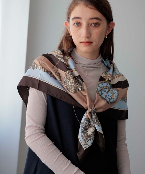 クロック柄スカーフ クラシカルな時計モチーフを配した「クロック柄スカーフ」。 上品な艶感のある生地と、繊細なプリントが目を引く一枚です。 90×90cmの大判サイズで、首元やバッグのアクセント、ヘアアレンジにも活躍。 シックな配色がスタイリングに洗練された印象をプラスします。 ■おすすめポイント 時計モチーフのクラシカルなデザインで大人の品格を演出。 なめらかな素材感で巻きやすく、季節を問わず使える万能アイテム。 首元・バッグ・ヘア・ベルト代わりなど、アレンジ自在。 ■おすすめコーディネート シンプルなシャツやニットに合わせて、首元に華やかさをプラス。 バッグのハンドルに巻いて、ワンポイントのアクセントに。 ジャケットスタイルに取り入れて、上品なトラッドコーデに仕上げるのもおすすめです。