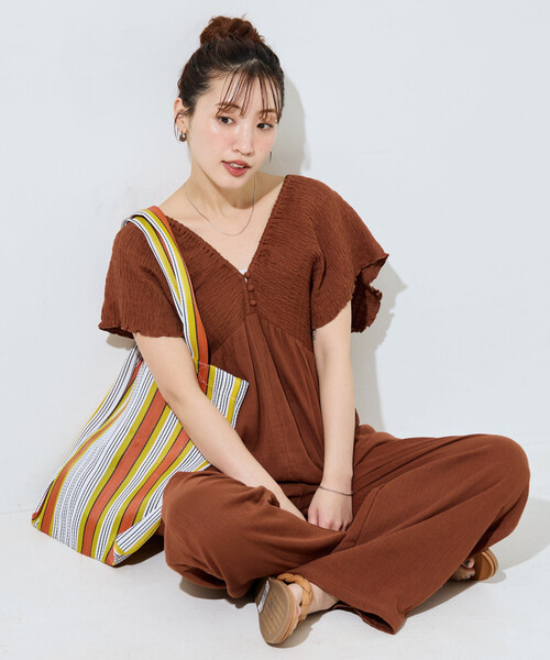 2026 Spring & Summer item ヘルシーな肌見せが叶う! 大人カジュアルに着映えるシャーリングオールインワン ●肩から胸下にかけて施したシャーリングと、深めのVネックが華やかで上品な印象に ●フロントはクルミボタン、バックはリボン仕様で、前後どちらから見ても抜かりないデザイン ●フロントはすっきり、バックスタイルにはたっぷりギャザーを入れたメリハリのあるシルエット ●さらっとした肌触りのダブルガーゼ楊柳生地を使用し春夏に心地よく着られる一着 ●両サイドポケット付きでデザイン性と実用性を両立! ●SMサイズ展開で自分に合ったシルエットを選べるのも嬉しいポイント ●旧品番1346248900527にブラウンとブルーが新色追加 ========== ■シリーズ商品 1304248900027:インドダブルガーゼヘンリーボタンロングスリーブ 1346248900537:インドダブルガーゼシャーリングオールインワン おすすめコーディネート 一枚で着映えするオールインワンは、フラットサンダルやトートバッグを合わせてラフに着こなすのがおすすめ◎ 肌寒い日は、シアーシャツやライトジャケットを羽織れば大人カジュアルにまとまります。 ヘルシーな肌見せを活かした、抜け感のあるスタイリングが楽しめます! --------------------------------------------------------- お気に入り登録のオススメ ▼商品のお気に入り登録▼ 再入荷、残り1点、セールなどの通知を受け取ることができます。 ▼ブランドのお気に入り登録▼ 新商品や再入荷、ショップのおすすめトピックスなど、いち早くブランドの情報を受け取ることができます。 --------------------------------------------------------- ※掲載画像の商品の色味は、屋外や屋内の光の照射や角度により実物と色味が異なる場合がございます。また表示のサイズ感と実物は若干異なる場合もございますので、予めご了承ください。 ※寄り画像の色味が実物に近しいです。 ※着用、お取り扱いの際は、商品についている品質表示とアテンションタグを必ずご確認下さい。 ※こちらの商品はオンラインストア及び一部店舗での限定展開となります。 【FREAK'S STORE/フリークスストア】 「アメリカの豊かさとワクワク・ドキドキを日本に伝えたい」という想いからスタート。1986年の創業以来、洋服、雑貨、インテリアなど自分たちが本気でカッコ良いと思うものをセレクト。積極的に楽しむ生活体験者=フリークとして、アメリカンライフスタイルの楽しみ方を提案するセレクトショップです。