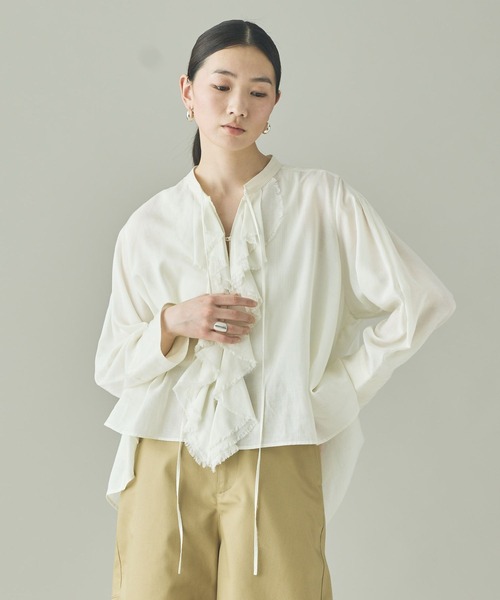 ラフな抜け感と華やかさを兼ね備えたフリルブラウス ■デザイン ・ウールボイルフリルブラウスと同型のデザインを採用。 ・フリル端をあえて裁ち切りでほつれさせることで、甘さの中にラフな抜け感をプラス。 ・フロントはボタンを締めても、羽織りとしても着用可能な万能な一枚。 ・襟元の紐は結ばずにそのまま垂らし、気取らない着こなしを楽しむのがおすすめ。 ・ジャケットのインナーとして合わせれば、コーディネートを一層華やかに演出。 ■素材 / お手入れ方法 ・ラミー混ポリエステルの軽やかな平織り素材を使用。 ・ラミー特有のムラ感ある表情と、ポリエステルのきれい見えする質感が好バランス。 ・ご自宅での洗濯が可能なウォッシャブル仕様。 ・ラミーの粗野感を生かした風合いのため、肌当たりが気になる場合はカットソーとのレイヤードがおすすめ。 【Curensology(カレンソロジー)】 旅とは、非日常と日常の間を行ったり来たりしながら、その土地の空気や風景、文化、歴史、そして出会いを、五感のすべてを使って受け止めること。「カレンソロジー(Curensology)」は、そんな旅をイメージした、知的でエレガントな女性のためのワードローブとテキスタイルを提案。バカンスや出張に持っていきたい機能的なアイテムをはじめ、日々の暮らしをアップデートする新しいデザイン、着心地の良いエッセンシャルなものなどを展開しています。 ※サンプルにて撮影をしておりますので、実際の商品とは仕様や加工・サイズ等が若干異なる場合がございます。 ※屋外の光や照明の当たり具合で、実物と色味が異なって見える場合がございます。詳細画像の色味をご確認ください。 なお、商品の色や質感を出来るだけ忠実に再現するよう心掛けておりますが、パソコンなどの環境により、実物と若干異なる場合がございます。 ▼商品のお気に入り登録をおすすめします▼ ♡をクリック!完売カラーの再入荷や、ラスト1点の通知、セールの際の通知を受ける事ができます。ブランドのお気に入り登録もご一緒にお願い致します。