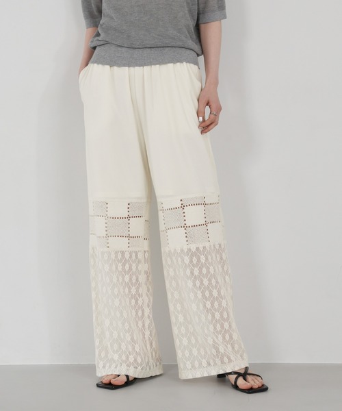 -point- & -styling- シンプル合わせで気映える、春のレースパンツ。 春らしい軽やかなレースをパネル状に組み合わせたリラックスパンツ。 レース特有の柔らかさと透け感があり、シーズンムードを高める1枚。 裏地つきで安心感がありつつ、ほんのり透けるレースで抜け感をプラス。 ウエストはゴム仕様でイージーな履き心地かつ 程よいハリと柔らかさがあり、肌あたりのよい軽やかな風合い。 繊細なレースが歩くたびに揺れ、シーズンムード高まる1枚に仕上げました。 ウエストゴムストレートシアーリラックスパンツ ---------------------------- 素材 (表地)ポリエステル98%・ポリウレタン2% (裏地)ポリエステル100% (レース上側)綿70%・ポリエステル30% (レース下側)綿35%・レーヨン35%・ポリエステル30% ---------------------------- 伸縮性 なし 生地の厚さ ★★☆☆☆ 裏地 あり ---------------------------- ※モニター・環境等により実際の商品と多少色味が異なって表示される場合がございます。 予めご了承をお願いいたします。 ======================= ■袋梱包の為、染料による特有の匂いが抜けきれず、匂いがする場合がございますが不良品にはあたりません。 上記注意点での返品、交換はお断りします。ご了承の上お買い求めくださいませ。 ■本製品は生産過程におきまして色味、サイズ感等若干の誤差が出る場合がございます。予めご了承くださいませ。 ======================= 【お買いものをお楽しみいただく為に!】 ▼商品のお気に入り登録 完売カラーの再入荷通知や、ラスト1点の通知、セールの通知も受け取ることができます。 ▼ブランドのお気に入り登録 新商品や再入荷など、いち早くブランドのお得な情報を受け取ることができます!