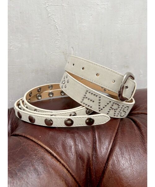 細身ベルトと通常幅ベルトの2本セットで展開する、オリジナルデザインのベルトです。スタッズはすべて手打ちによるハンドメイド仕様で、一点一点表情のある仕上がりです。太幅ベルトはデザインからスタッズ配置までこだわった完全オリジナルで、スタイリングのアクセントとして活躍。ウエスト使いはもちろん、ベアトップやデニムオールインワンなど、バスト位置に着用する新しいスタイリングもおすすめです。