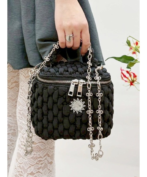 表面感がぽこぽことした、立体感のある素材を使用したバニティーBAGです。バッグ内部にはリップケースを備え、女性のお出かけに嬉しい実用性もポイント。他にはない個性的なデザインのショルダーチェーンを採用し、細部までこだわったアイテムです。