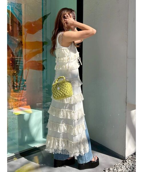 贅沢に入れたフリルデザインがポイントのロングジレです。フリル部分はレース生地を使用しており、異素材MIXのデザインになっています。フロントリボンで、裾は大胆なスリットデザインのため、ボトムがしっかり見えてメリハリのあるスタイリングに仕上がります。ビスチェやデニムとのスタイリングが、ボーホー感がありおすすめです。