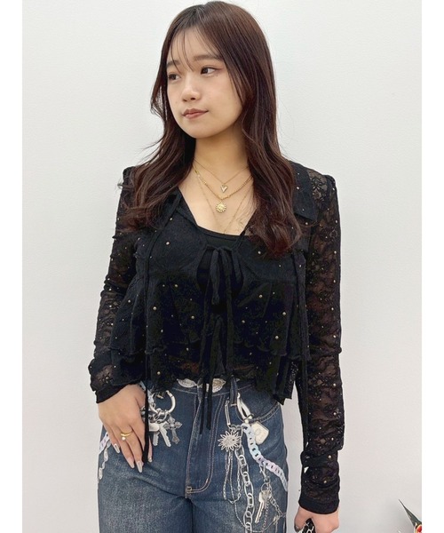 レース素材にスタッズのホットフィックスをつけた オリジナル生地を使用したブラウスです。 ストレッチ製のある生地でストレスフリーに着用できます。 トレンドのフロントリボンもポイントで インナーにはビスチェやブラトップを合わせた肌見せスタイリングがおすすめ。