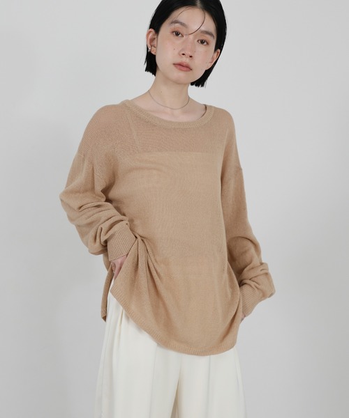 -point- & -styling- しなやかな落ち感が魅力のリネンブレンドシアールーズニット 身体を泳がせるゆとりのあるシルエットに、 ほどよい透け感が涼しげに着こなせる大人の一着。 麻と綿の混合素材で汗をかいても肌離れがよく、 湿度の高い梅雨時期や夏場にもサラリと快適な着心地です。 サイドスリットが軽やかさを演出してくれます◎ インナーはノースリーブやキャミ、ベアトップが◎ サテンパンツなど光沢のある異素材ボトムとの組み合わせが好相性です。 上品さと抜け感を両立した大人スタイルが完成します。 ラウンドネックサイドスリットリネン混コットン混長袖シアーニット ---------------------------- 素材 麻55%・綿45% ---------------------------- 伸縮性 ★★★☆☆ 裏地 なし ---------------------------- ※モニター・環境等により実際の商品と多少色味が異なって表示される場合がございます。 予めご了承をお願いいたします。 ======================= ■袋梱包の為、染料による特有の匂いが抜けきれず、匂いがする場合がございますが不良品にはあたりません。 上記注意点での返品、交換はお断りします。ご了承の上お買い求めくださいませ。 ■本製品は生産過程におきまして色味、サイズ感等若干の誤差が出る場合がございます。予めご了承くださいませ。 ======================= 【お買いものをお楽しみいただく為に!】 ▼商品のお気に入り登録 完売カラーの再入荷通知や、ラスト1点の通知、セールの通知も受け取ることができます。 ▼ブランドのお気に入り登録 新商品や再入荷など、いち早くブランドのお得な情報を受け取ることができます!