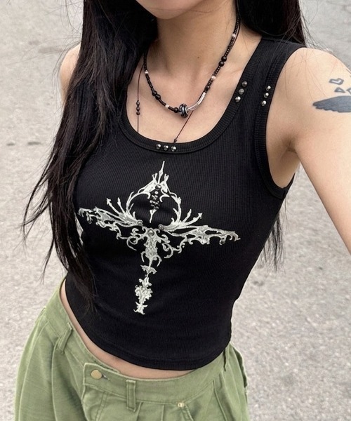 ハードな装飾と華奢見えシルエットが交差する、スパイシーな主役級キャミ ◆DETAIL◇ フロントに施されたデコラティブなクロス風グラフィックが目を引く、トレンド感溢れるタンクトップです。 ネックラインとグラフィック部分に散りばめられた立体的なスタッズが、顔周りにエッジの効いたアクセントをプラス。 ボディに優しくフィットするリブ素材と、デコルテを綺麗に見せる絶妙なUネックラインが、女性らしい華奢なシルエットを演出します。 ストリートな雰囲気の中にモードなスパイスを効かせた、今季大注目のY2Kデザインアイテムです。 ◆COORDINATE◇ ・ローライズのデニムやワイドパンツと合わせて、ヘルシーな肌見せを楽しむ王道のY2Kスタイルに。 ・シャツやカーディガンのインナーとして合わせ、スタッズをチラ見せさせるレイヤードスタイルもおすすめ。 ・レザーのボトムスやスタッズベルトをプラスすれば、よりクールでパンキッシュなストリートコーデが完成します。 ◆POINT◇ ・タンクトップ ・キャミソール ・スタッズアクセント ・グラフィックプリント ・リブ素材 ・タイトシルエット ・Y2Kファッション ・韓国ファッション ・ストリート系 ・デイリーユース ・スタッズ ・ノースリーブ ・クロス ・ゴシックグラフィック ・コンパクト ・ショート丈 ・ミニ丈 ・Y2K ・グランジ ・華奢見え ・細見え ・フロントデザイン ・夏服 ・春夏 ・スタッズ ・グラフィック ・リブ ・Y2K ・Y2Kコーデ ・着回し ・韓国 ・韓国コーデ ・韓国ストリート .・グランジファッション ・スタイル盛れ ・スタイルアップ ・ピチT ・プリント ・リブ ・肌見せ ----------------------------------------- 【サイズ展開】フリーサイズ 【4色展開】ホワイト/ブラック/グレー/ブラウン ----------------------------------------- <着用レビュー> 【スタッフA 158cm/45kg 骨格ウェーブ】 伸縮性のあるリブ生地なので、体に程よくフィットしてスタイルを良く見せてくれます。 スタッズのキラキラ感が可愛くて、ネックレスなしでも華やかな印象になります! 【スタッフB 164cm/52kg 骨格ストレート】 首元がスッキリ開いているので、肩周りが華奢に見えるのが嬉しいです。 着丈も長すぎず短すぎず、どんなボトムスともバランス良く合わせやすい万能アイテムです。 ※着用身長によって画像イメージと異なる場合があります。 ※撮影環境により、実際のカラー、形状、デザイン等多少異なる場合がございます。 《 お知らせ 》 ▼商品のお気に入り登録 お気に入りアイテムの値下げ・再入荷・在庫1点などの通知を受け取ることができます。 ▼ブランドのお気に入り登録 新商品や再入荷、セール、クーポン配布などお得な情報を受け取ることができます。 是非、お気に入り登録してみてください!