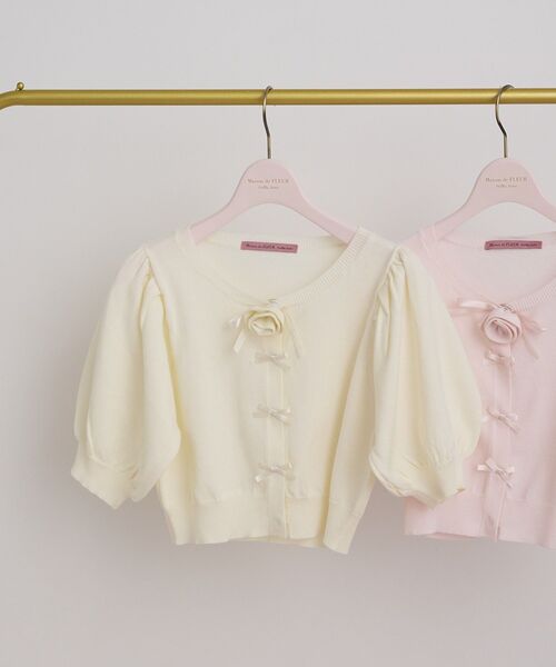 Maison de FLEUR Petite Robe ローズモチーフとサテンリボンがガーリーな半袖のカーディガン。 ふんわりとしたパフスリーブで、女性らしいシルエットに仕上げました♪ ハイゲージの編み地を使用しており、きちんと感のある上品な印象に◎ フロントはスナップボタン仕様で、着脱しやすいのも嬉しいポイント! カジュアルなボトムスからボリュームスカートまで、幅広く合わせていただけるアイテムです。 【注意事項】 ※サンプルにて撮影を行っております。 実際にお届けする商品と仕様やサイズが異なる場合がございます。 ● Maison de FLEUR ● (メゾン ド フルール) 贈り物で、世界にしあわせを咲かせる。 フレンチテイストをベースに、上品で洗練されたデザインで、 贈るひとときを大切にするギフトブランドです。 「可愛い」と感じた瞬間から、包みを開ける時、そしてその先まで。 心に残る体験として届けることを大切にしています。 ▼ 商品のお気に入り登録がおすすめです ▼ 商品ページ内のハートマークをクリック。 完売時の再入荷や、最後の1点の通知、コーディネート画像がアップされたとき、お得なお値下げの際の通知を受ける事ができます。 【お知らせ】ページでも通知が確認できます。